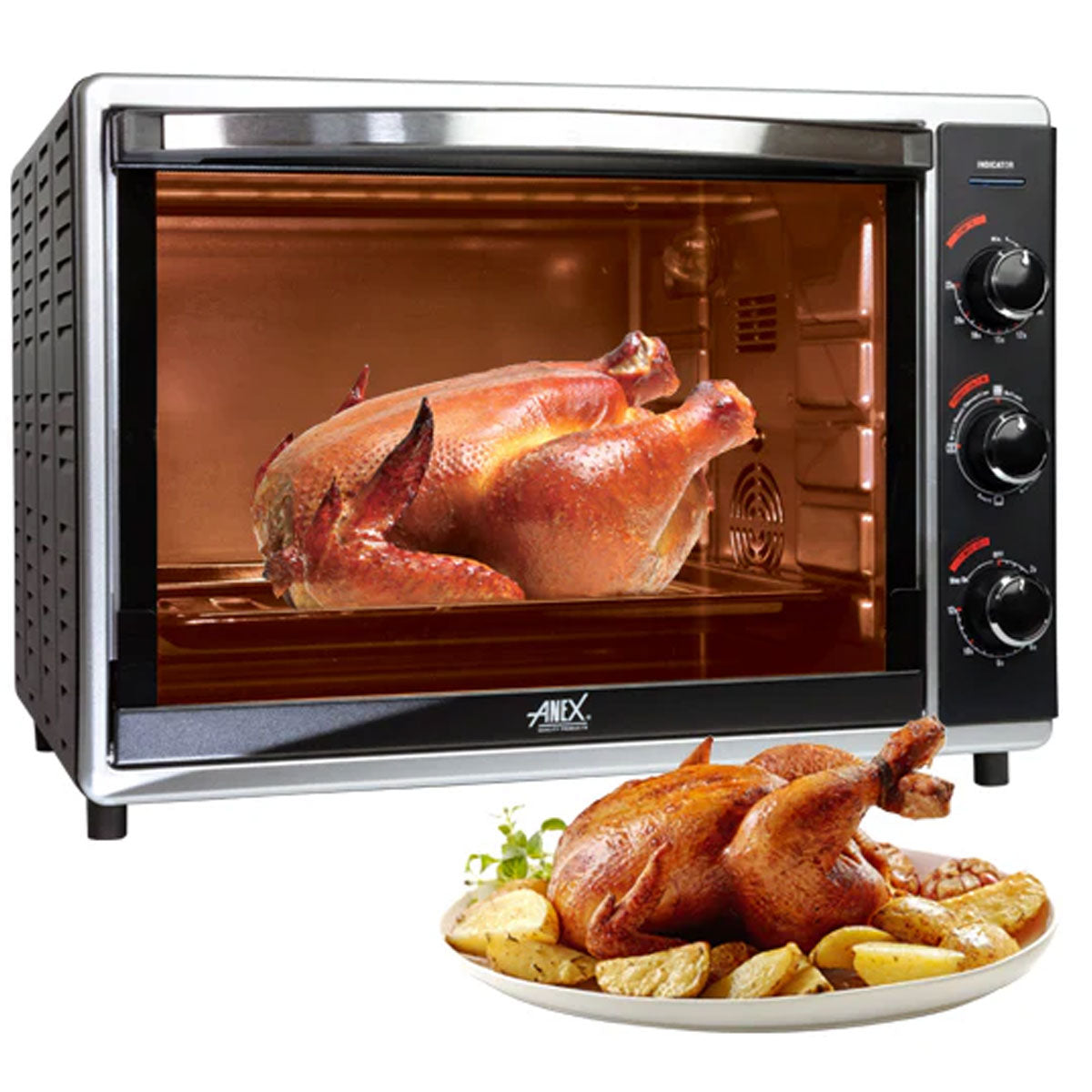 Features: Elegant design high power deluxe oven with adjustable thermostat control from 0C to 230C. Convection fan, allowing the air to move around the oven to a consistent temperature. Convenient heat operating switch for a variable heating position with 120 minutes automatic timer to turn off. Spacious interior for backing, roasting, toasting, rolls, bread, pizza, sausage,