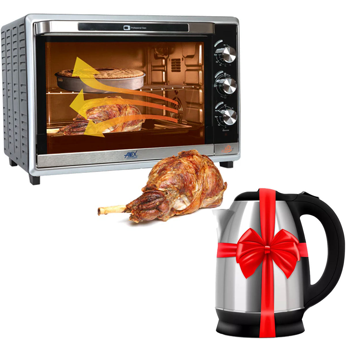 Features: Elegant design high power deluxe oven with adjustable thermostat control from 0°C to 230°C. Convection fan, allowing the air to move around the oven to a consistent temperature. Convenient heat operating switch for a variable heating position with 120 minutes automatic timer to turn off. Spacious interior for backing, roasting, toasting, rolls, bread, pizza, sausage, and cookies also can be used for defrosting frozen foods. Power on the light indicator on the front panel. The removable backing plate is convenient for preparing and serving food. Stainless steel heating element.