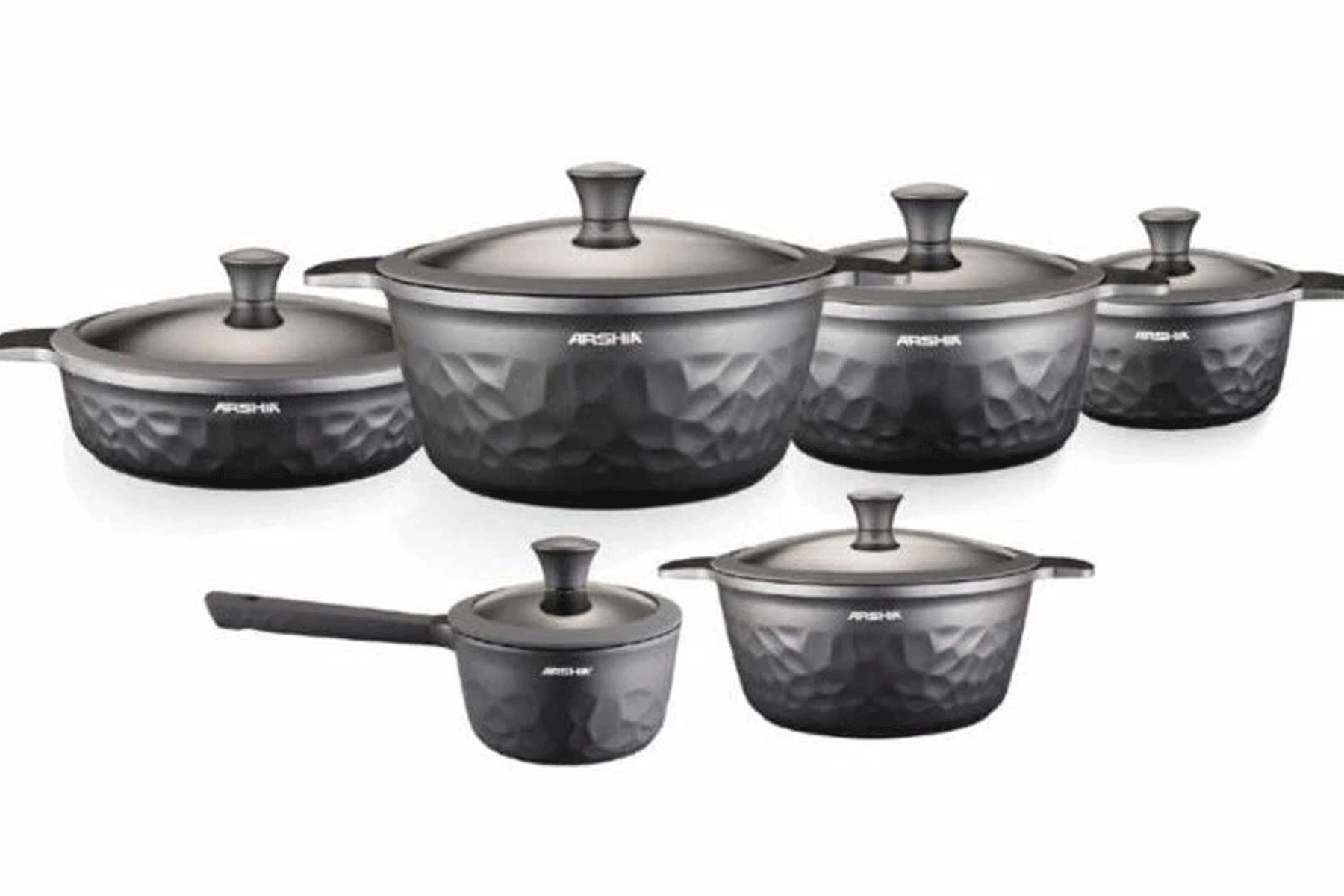Enhance your culinary adventures with the Arshia Premium Die-Casted Aluminium Diamond Cookware 12pcs in a stunning silver finish. This cookware set is a culinary masterpiece designed for those who demand the highest quality and style in their kitchen.