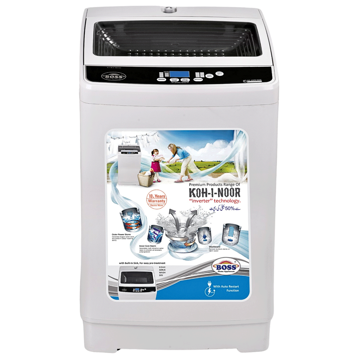 The BOSS Fully Auto-Wash K.E-AWM 9200 Classic Black Gray is a high-performance washing machine designed for efficiency and convenience. With a 10-kilogram capacity, it features a Mega Power Pulsator and a 100% Clean Magic Drum for superior cleaning results. Its modern and elegant design includes a built-in sink with a dumping door, enhancing usability. Engineered with an engineering-grade pure plastic body, it is rust and shock-proof, ensuring long-lasting durability. Equipped with inverter technology, it offers up to 70% energy savings, while the quick auto-restart function ensures seamless operation. Operating at a voltage frequency of 220V~50Hz, the machine has a rated wash capacity of 440W and a spin capacity of 325W. With a gross weight of 34.5 kg and a compact packing dimension of L610 x W610 x H990 mm, it fits easily into any space. Additionally, the lifetime warranty of 12.5 years on the electric motor guarantees reliability and peace of mind.