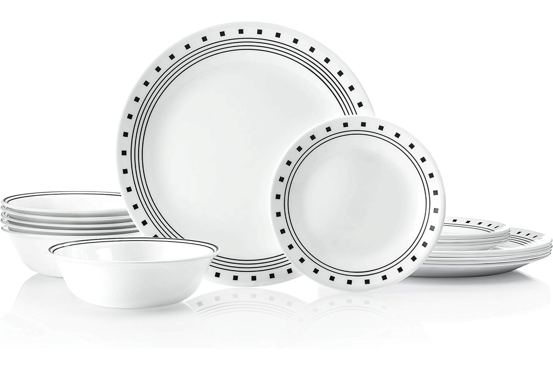Black stripes and bold squares give this 18-piece dinnerware set its urban edge. Each piece has a different design, and the coupe shapes layer for a casual, contemporary look that’s great for everyday and entertaining.