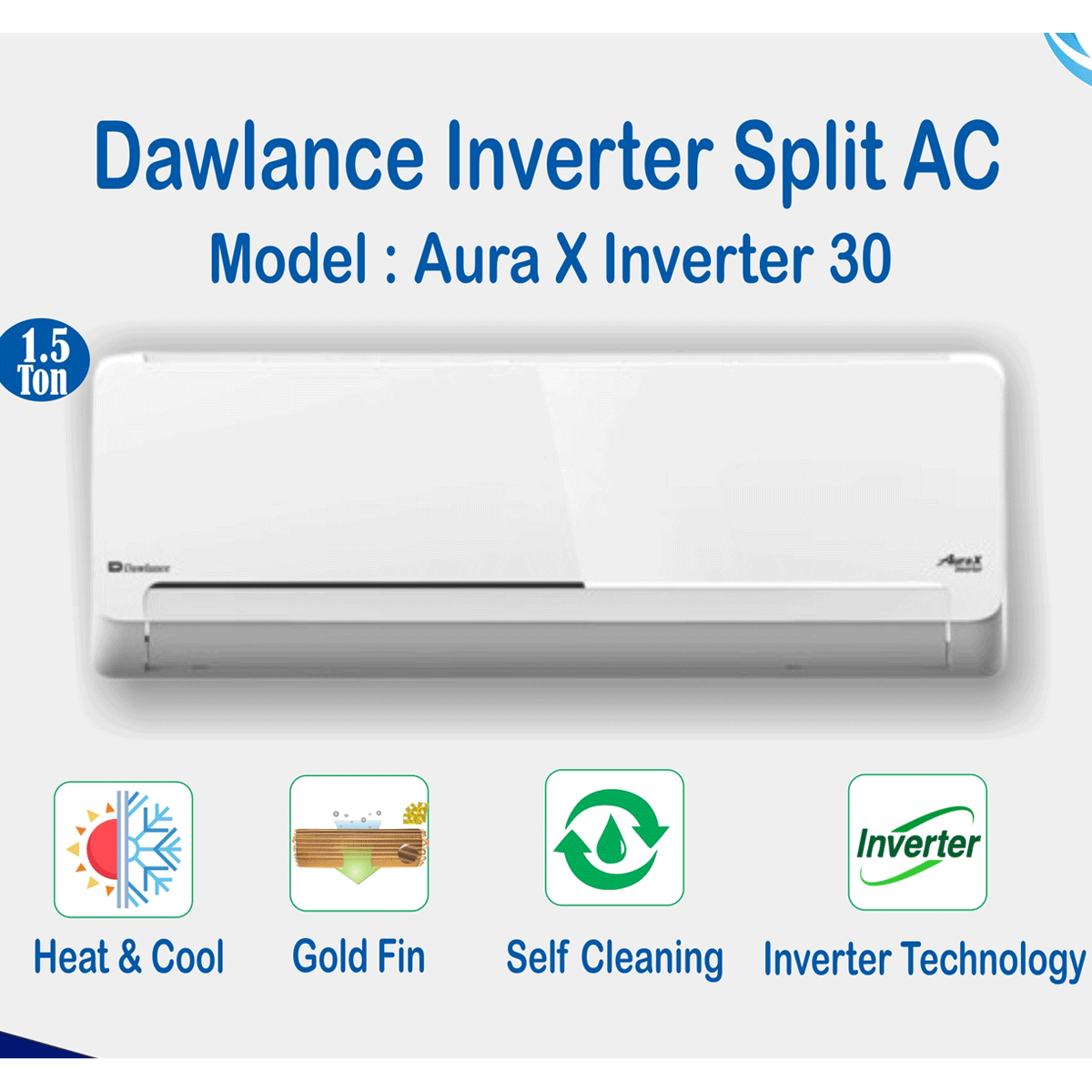 The Dawlance AURA X Inverter 30 is a split air conditioner known for its energy efficiency and advanced features. Here are some key specifications and features: