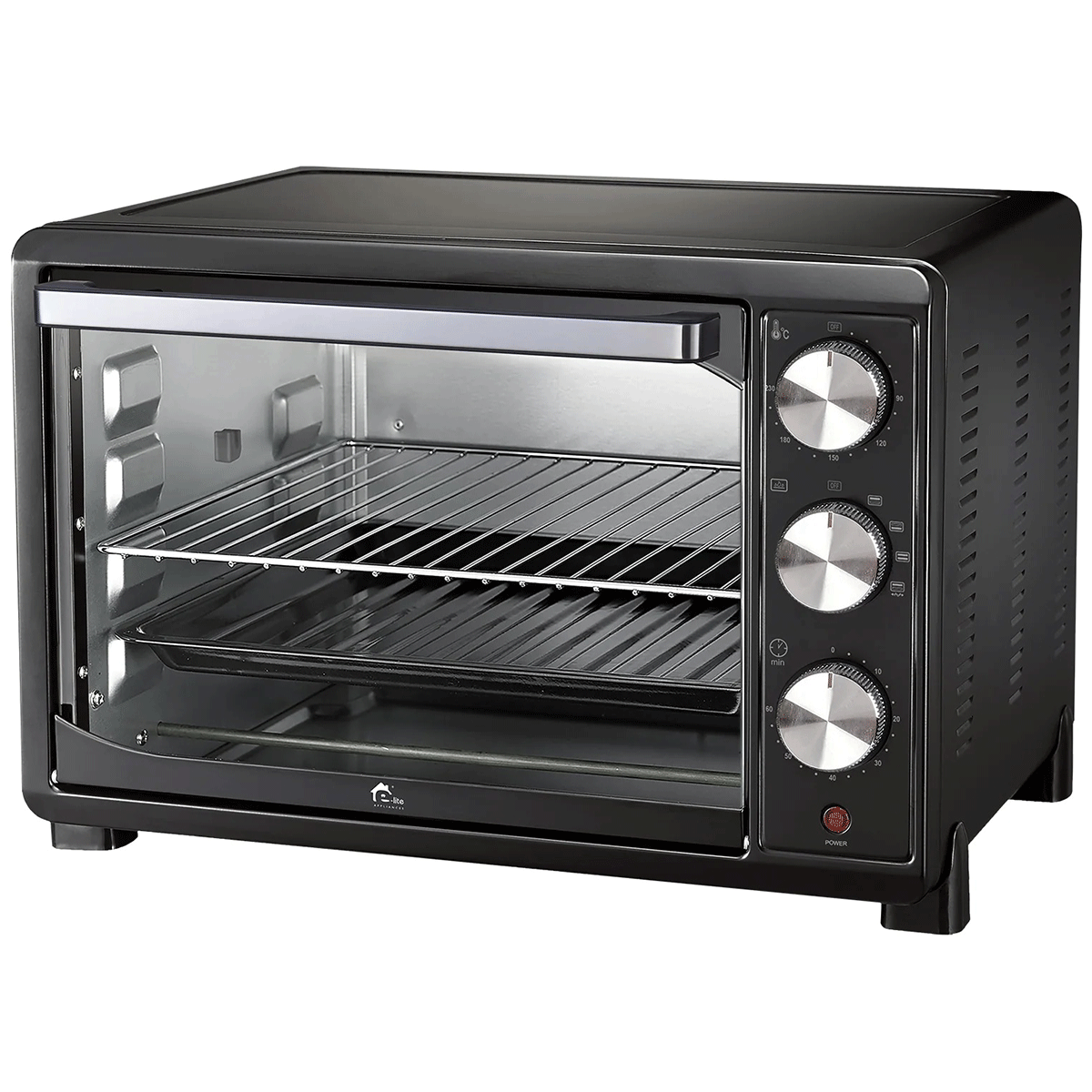 Our versatile microwave with a built-in rotisserie function, designed to elevate your grilling experience. This high-performance appliance features three easy-to-use control knobs for precise thermostat adjustment, heating rod function, and a convenient timer control. The 60-minute timer, equipped with a bell ring, ensures perfect cooking results every time.