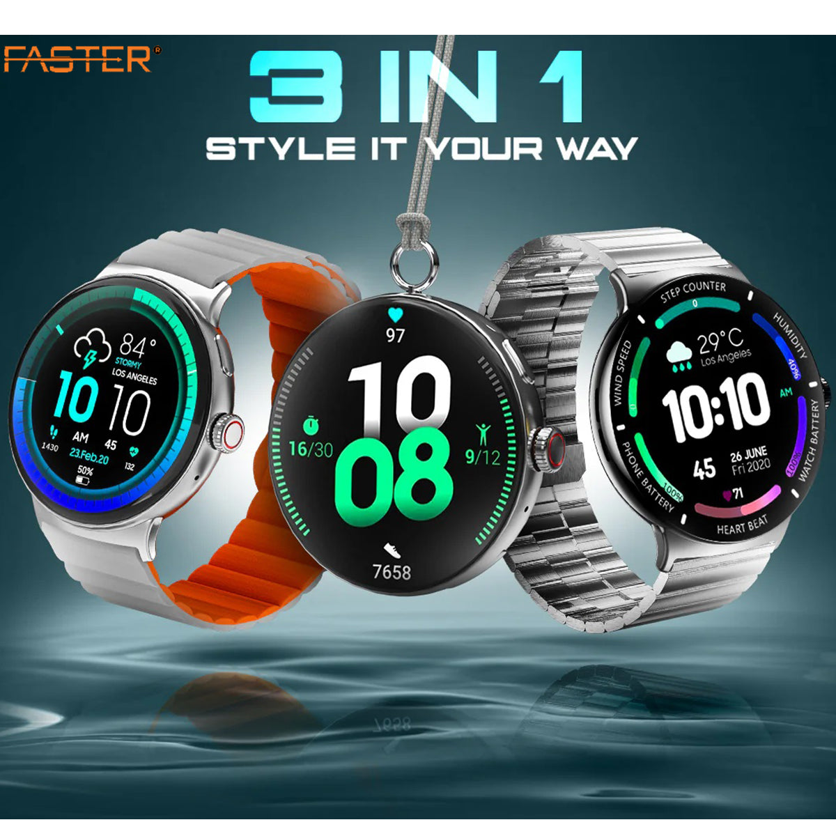Faster NERV Watch 4 Pro - 3 Straps: Silver Chain + Grey Silicon + Neck Band