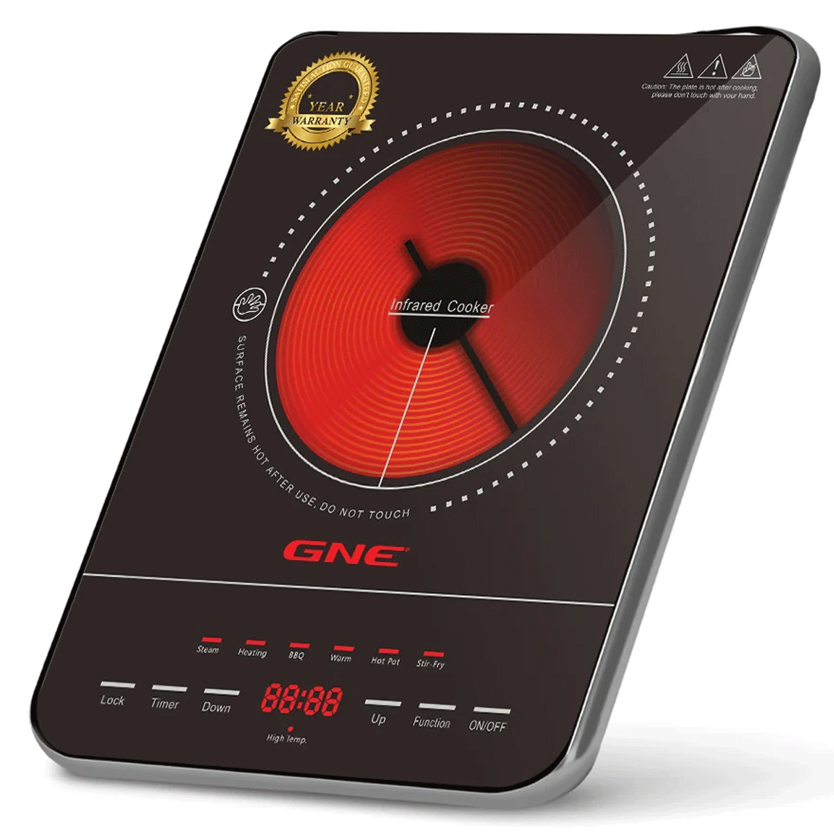 Gaba National Infrared Cooker - GN-142/22 Features: Whole A grade black tempered glass plate. Sliding touch control LED Display. Child Safety lock/Timer (0-240 minutes). 8 intelligent cooking functions. 8 level power setting 200w-2000w. 8 level temperature setting 100C-600C. Rated 220V-240V, 50/60/Hz, 200W.