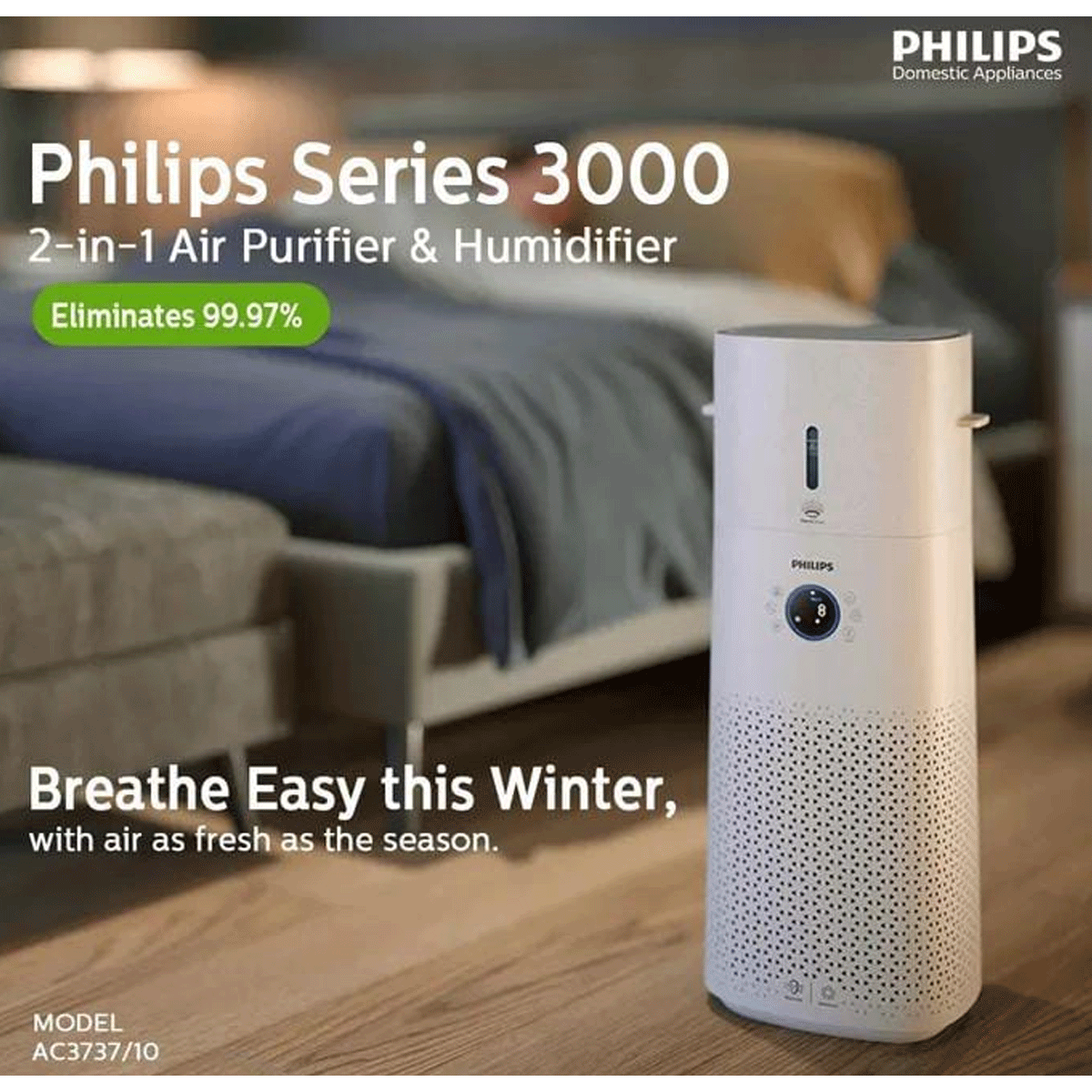 Philips 2-in-1 Purifier & Humidifier: Powerful performance, easy to use. Works as humidifier & purifier, or purifier-only with detachable water tank. Cleans large rooms thoroughly and eliminates 99.97% of pollutants and 99% of Formaldehyde.
