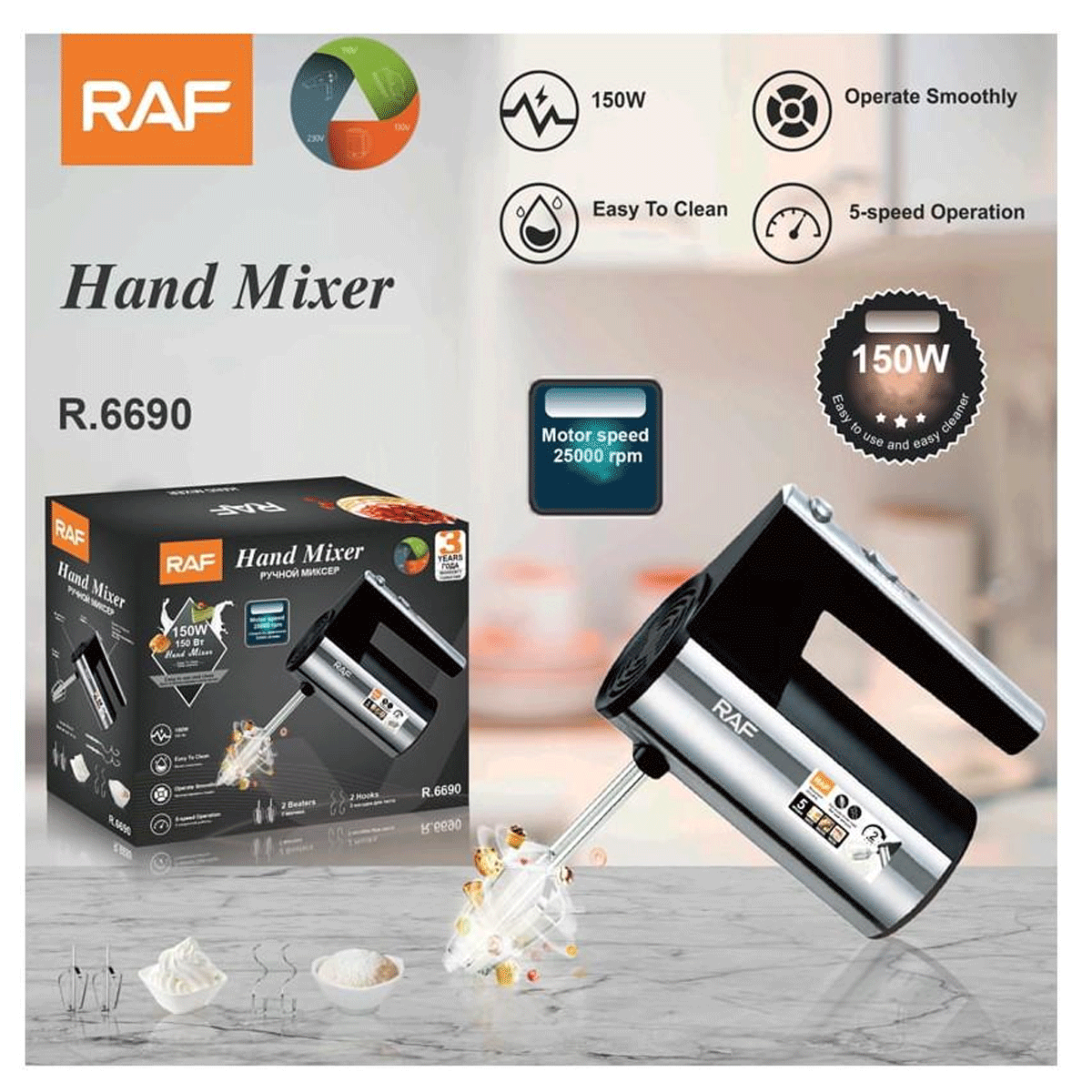 Introducing the RAF Hand Mixer and Egg Beater R.6690, an efficient electric hand beater designed to elevate your baking and cooking experience. This versatile egg beater eggs on at 600W, 220V, 50Hz power, with a motor speed of 25000rpm for quick and effortless mixing.