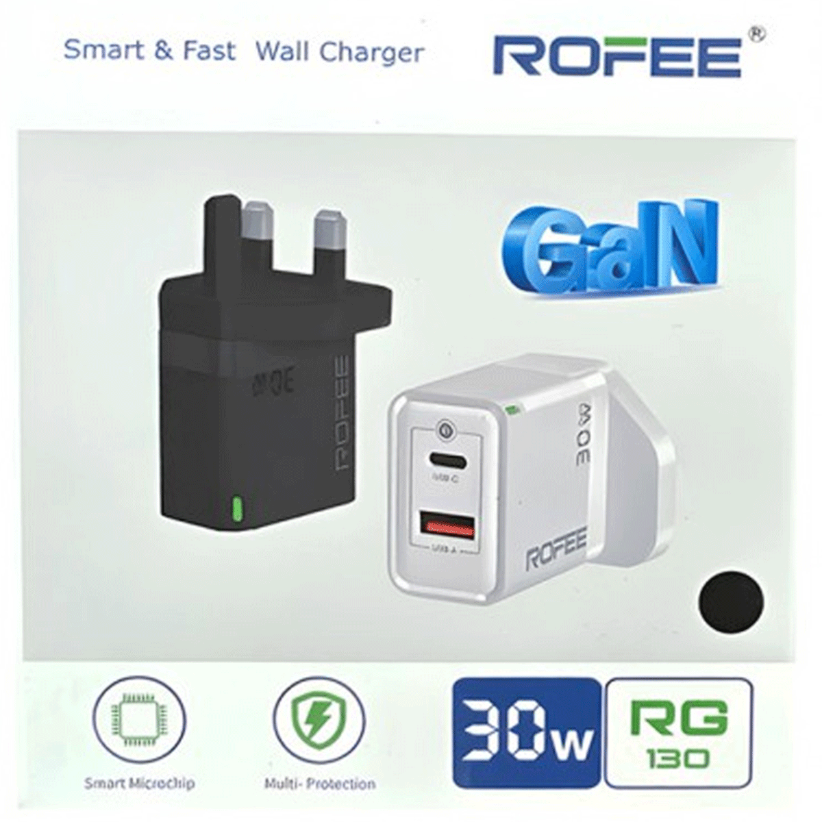 Rofee RG-130 Smart & Fast Dual Port USB-A&C 30W Wall GaN Charger Without Cable 3 Pin
