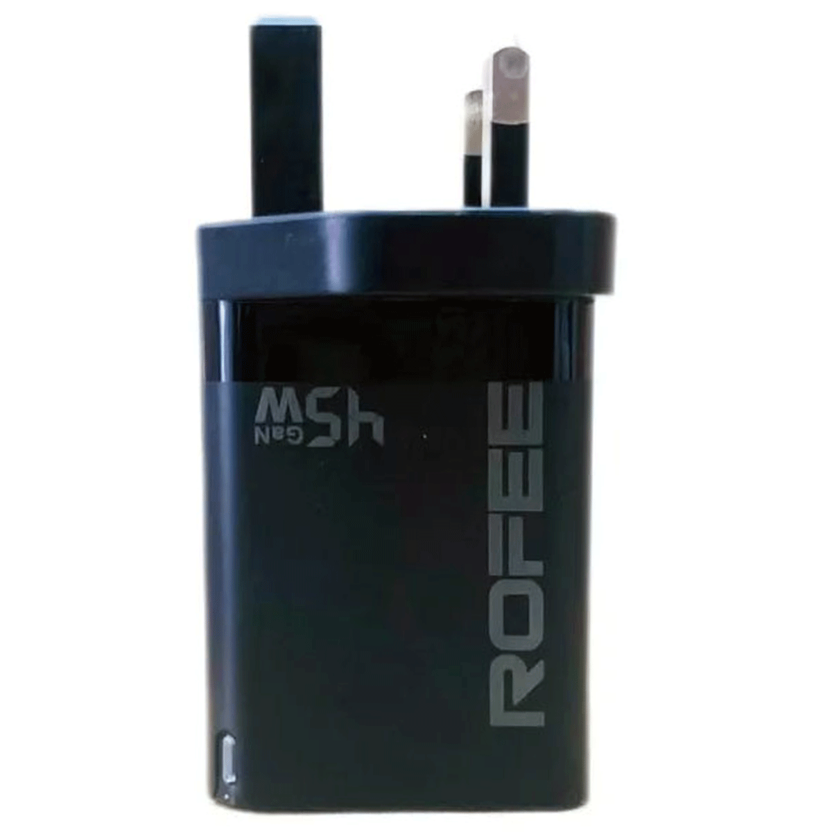 Rofee RG-145 Smart & Fast Dual Port USB-A 18W & USB-C 45W Wall GaN Charger Without Cable 3 Pin Black
